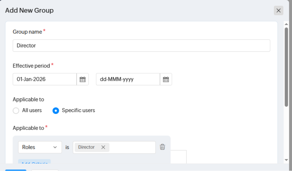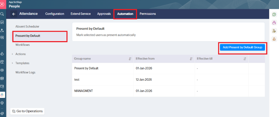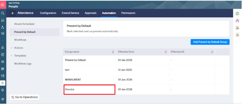 HR administrators can create a Present by Default group and apply it to a specific role, such as Director. Once configured, all employees assigned to the Director role are automatically marked as Present in the attendance records without requiring daily check-ins. Attendance is recorded as Present by default, and absence is reflected only when an employee applies for leave.